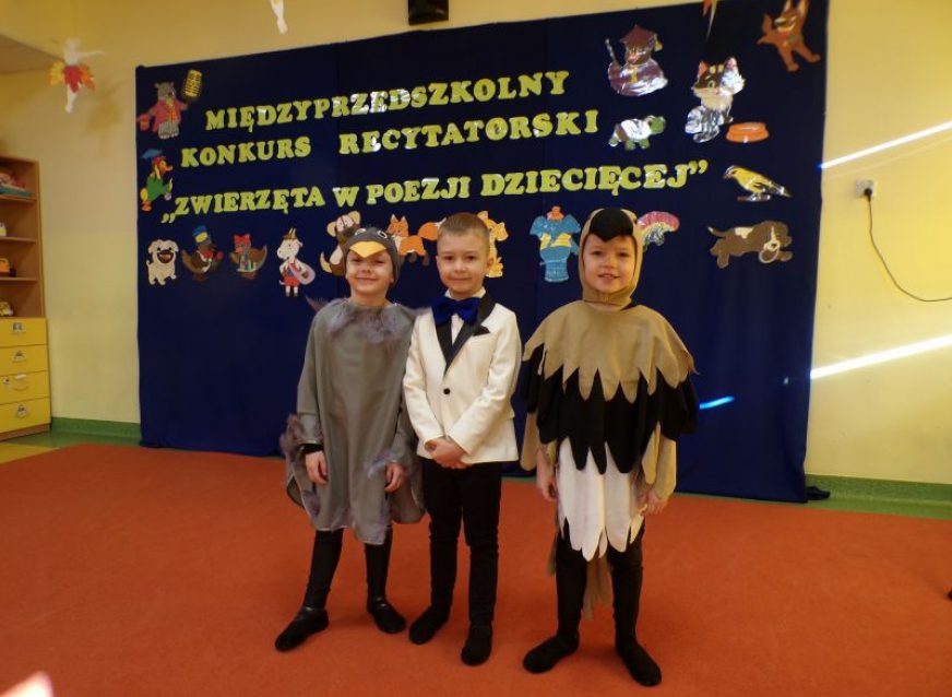 W dniu 18.01.2025r,. przedszkolaki  z grupy V  (Matyldzia, Leoś oraz Oluś) wzięli udział w konkursie recytatorskim pt.: ,,Zwierzęta w poezji dziecięcej” zorganizowany przez Publiczne Przedszkole Nr 26. Nasi mali artyści zaprezentowali zgromadzonej publiczności oraz jury wiersz pt.: ,,Spóźniony słowik” Juliana Tuwima. Wykonanie bardzo spodobało się innym uczestnikom konkursu, którzy nagrodzili dzieci gromkimi brawami. Komisja konkursowa wyłoniła laureatów. Nasze kochane przedszkolaki otrzymały wyróżnienie. Dzień ten był pełen emocji i dumy z naszych przedszkolaków- z niecierpliwością czekamy na kolejną edycje konkursu! 🙂